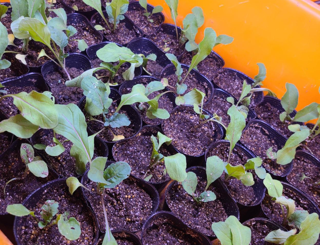 サラダやおひたしにして食べられるルッコラの苗の植え替え体験。