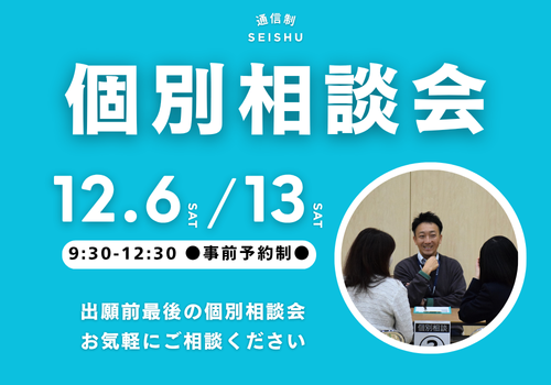 12月6日(土)、13日(土)に個別相談会を開催いたします。入学に関するご質問、学習面の不安、学校生活についてなど、個別にお答えいたします。ぜひご予約のうえ、ご参加ください。