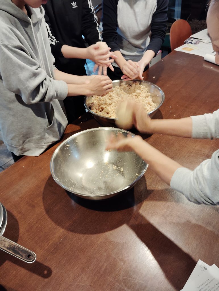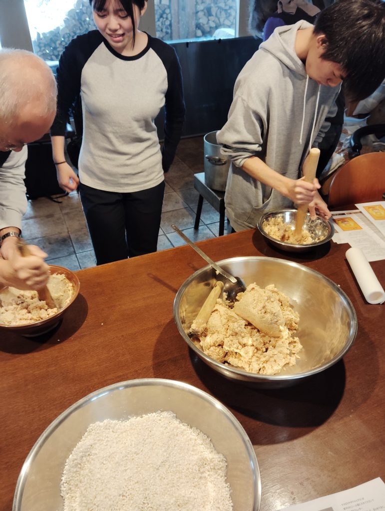 これが大変でボウルの中の大豆がすりこぎをすり抜け、なかなかつぶれなくて苦労しました。次に塩切麹を用意しました。大きいボウルに麹を入れ固まっているところをほぐしながら、塩をムラのないようによく混ぜました。