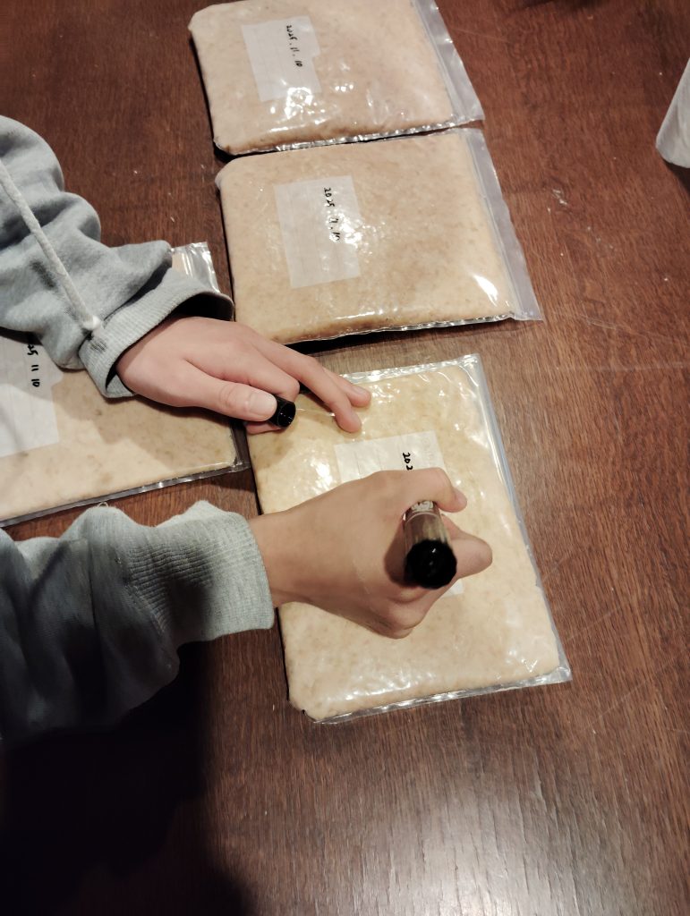 ジップロックに味噌玉を入れてこぶしで上から押さえ、空気を抜きながら表面を平らにならして、空気が残らず外からの空気が入らないようにジップロックを閉める。