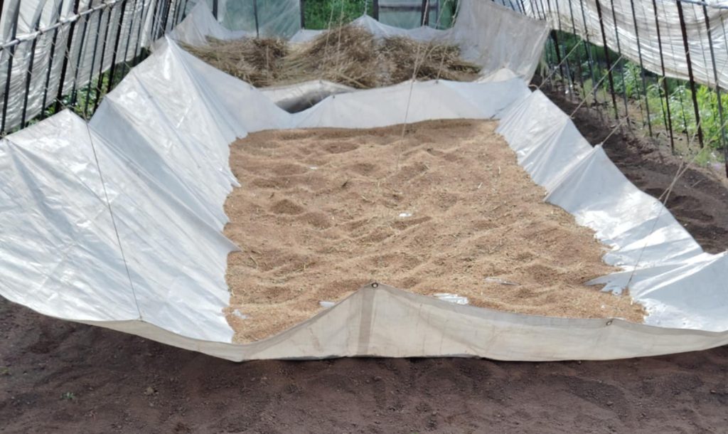 ▼今年の8月 収穫し、ビニールハウスの中で天日乾燥した小麦